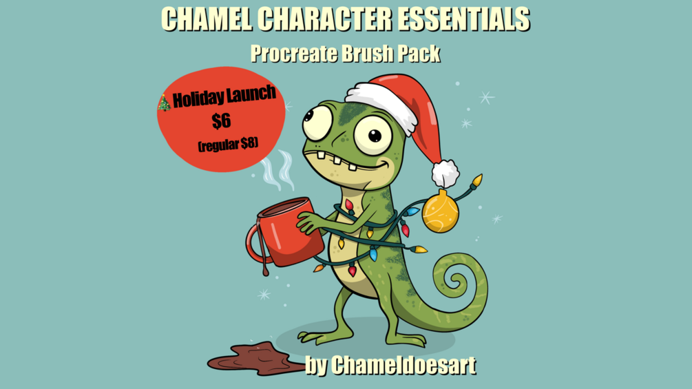 A curated set of 9 custom Procreate brushes I actually use for my character art Tools for every step of your workflow: sketching, clean lineart, flat colors, shading, texture and blending Both tapered ink and monoline brushes so you can switch between expressive and graphic styles Marker-style shading, soft textured shadows, and a crayon grit brush for storybook vibes A custom smudge brush tuned for soft blending without destroying your texture The exact setup used to draw the Chaos Christmas Chameleon cover illustration, so you can see what the pack can do in a real piece